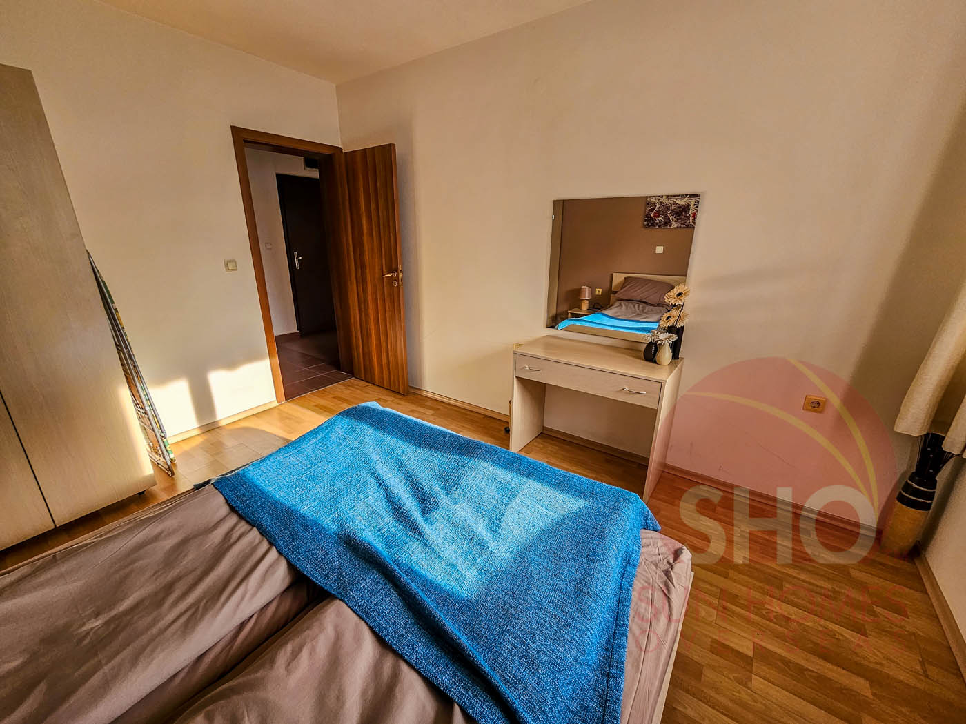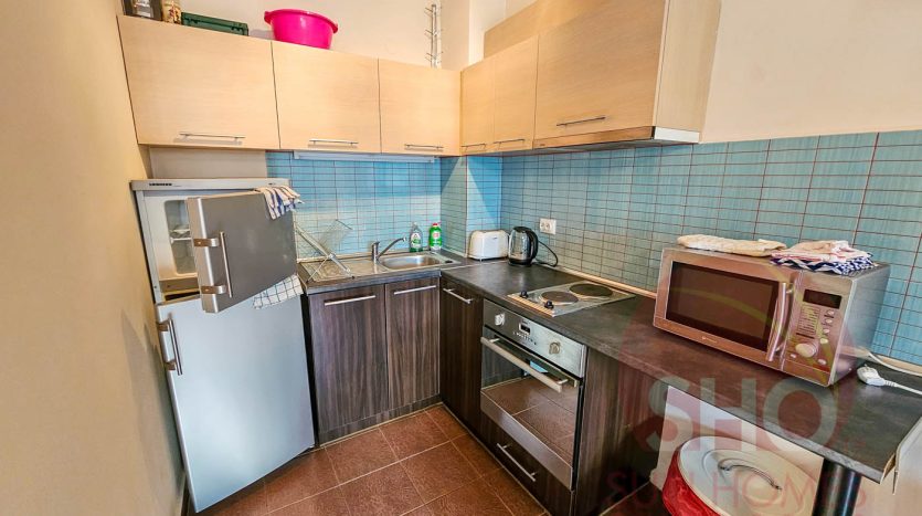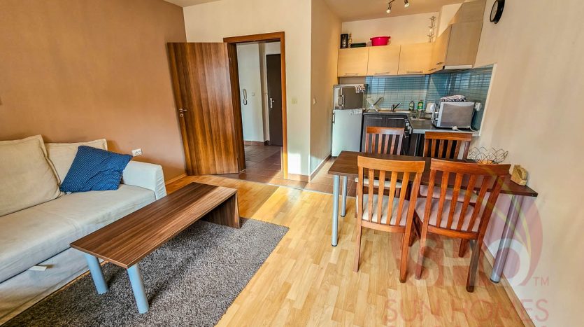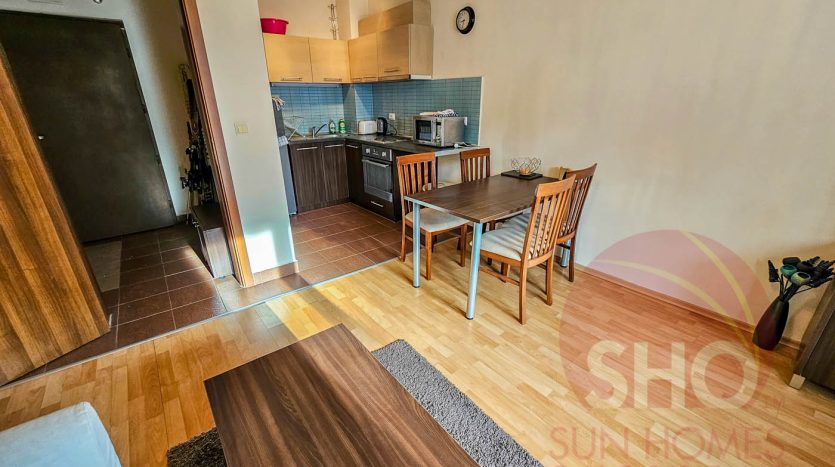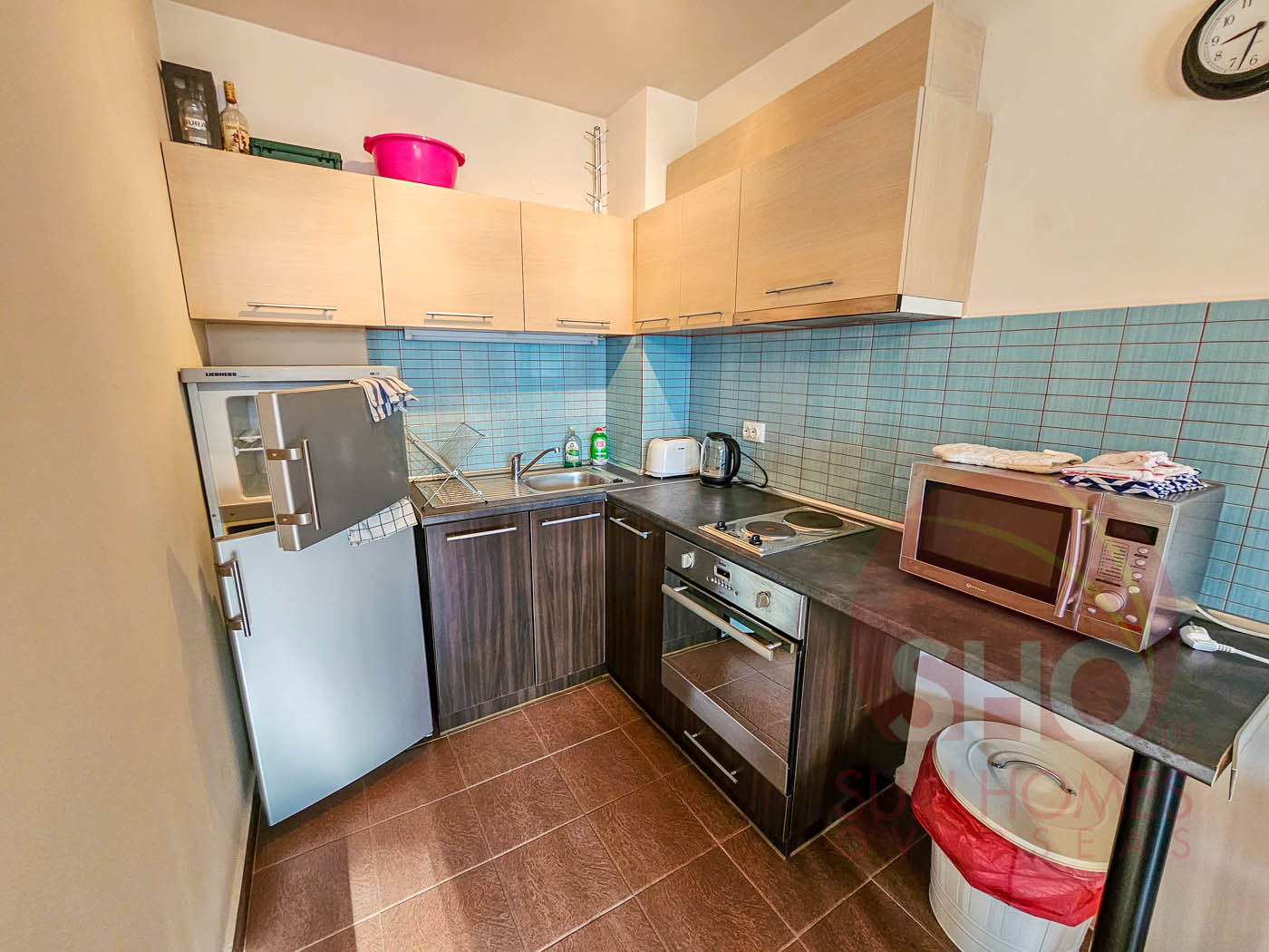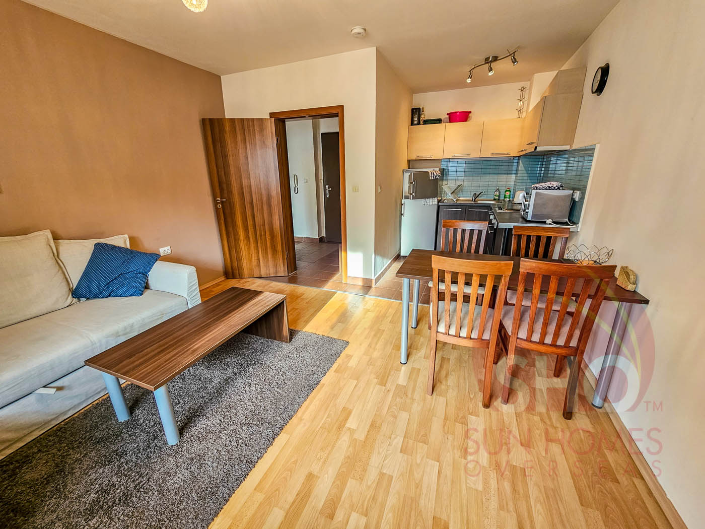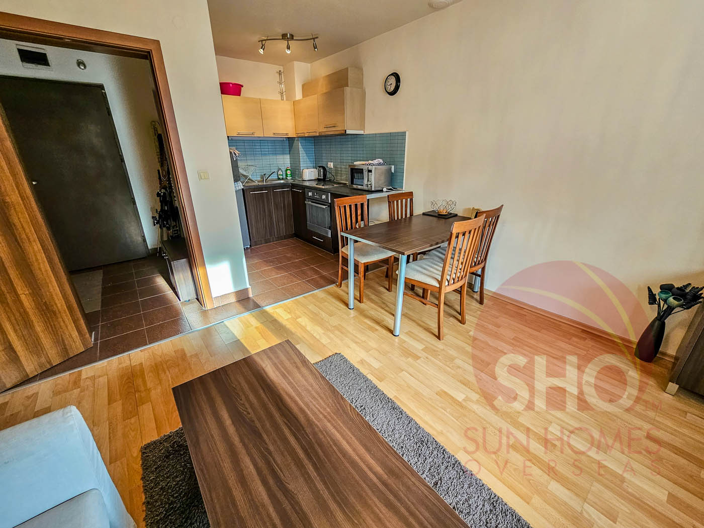 A raised level ground floor 1 bedroom apartment which is to be sold furnished. The property consists of an entrance, fully tiled bathroom with shower cabin, fully equipped kitchen with white goods, dining table / chairs, lounge area with sofa bed/ TV/ storage units, double sized bedroom with double