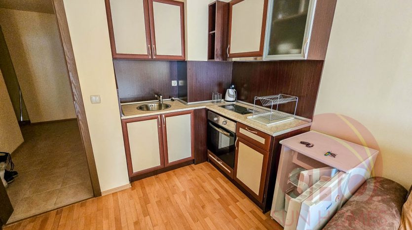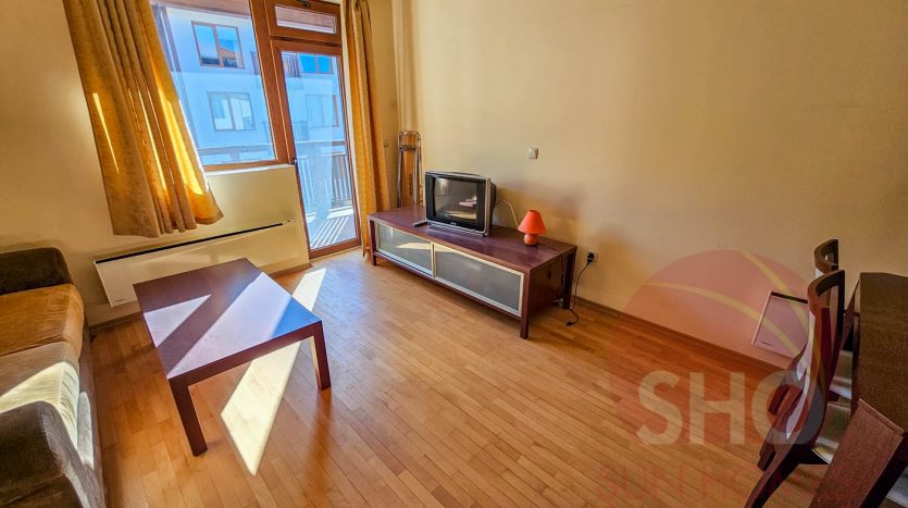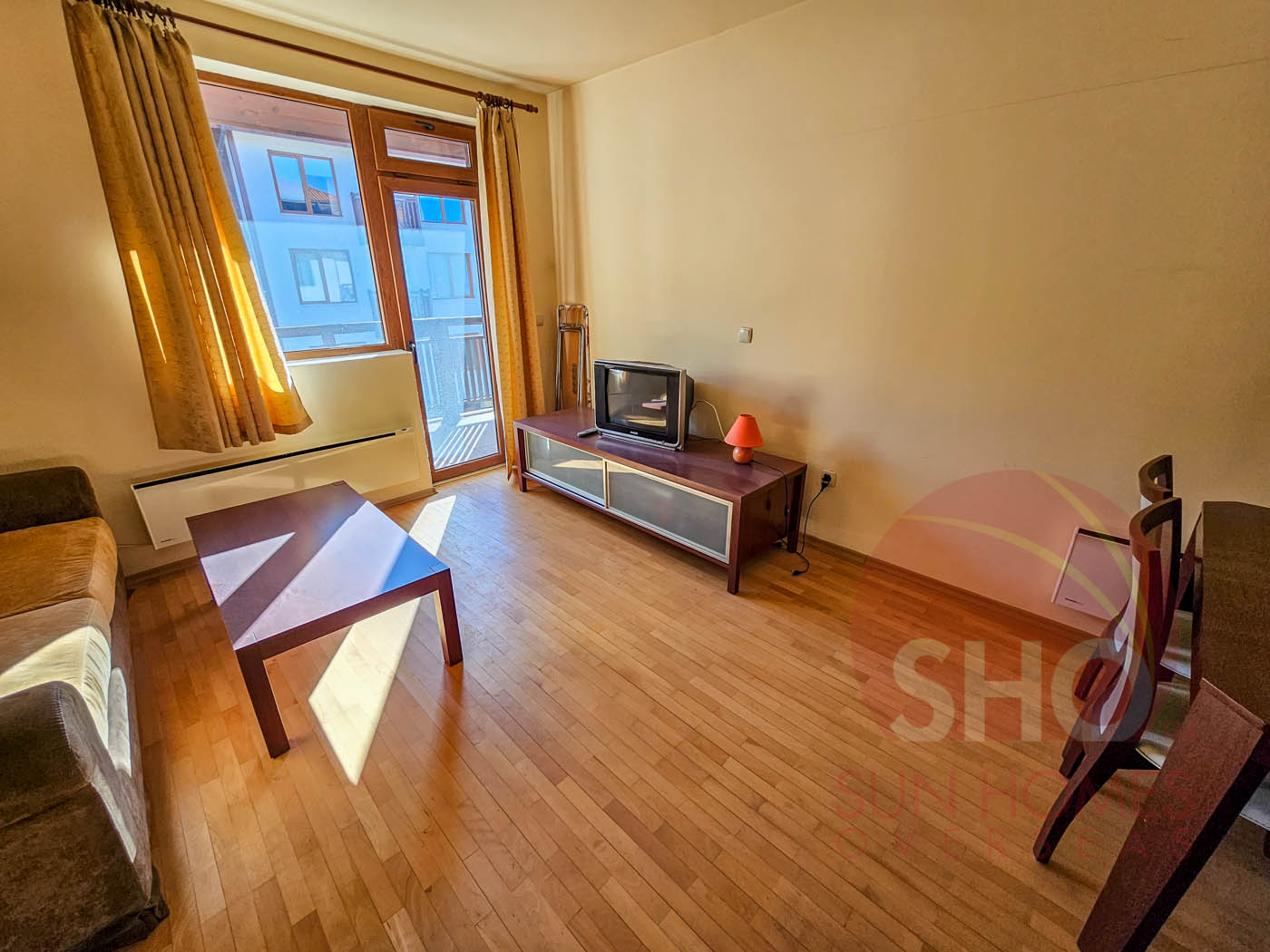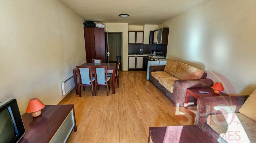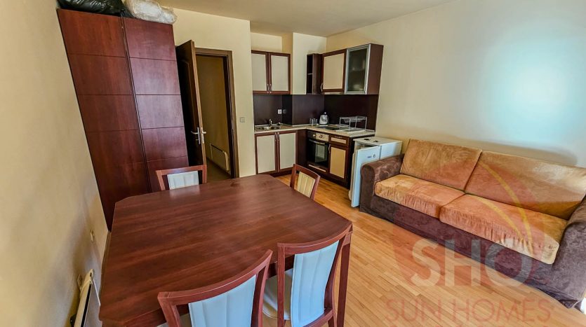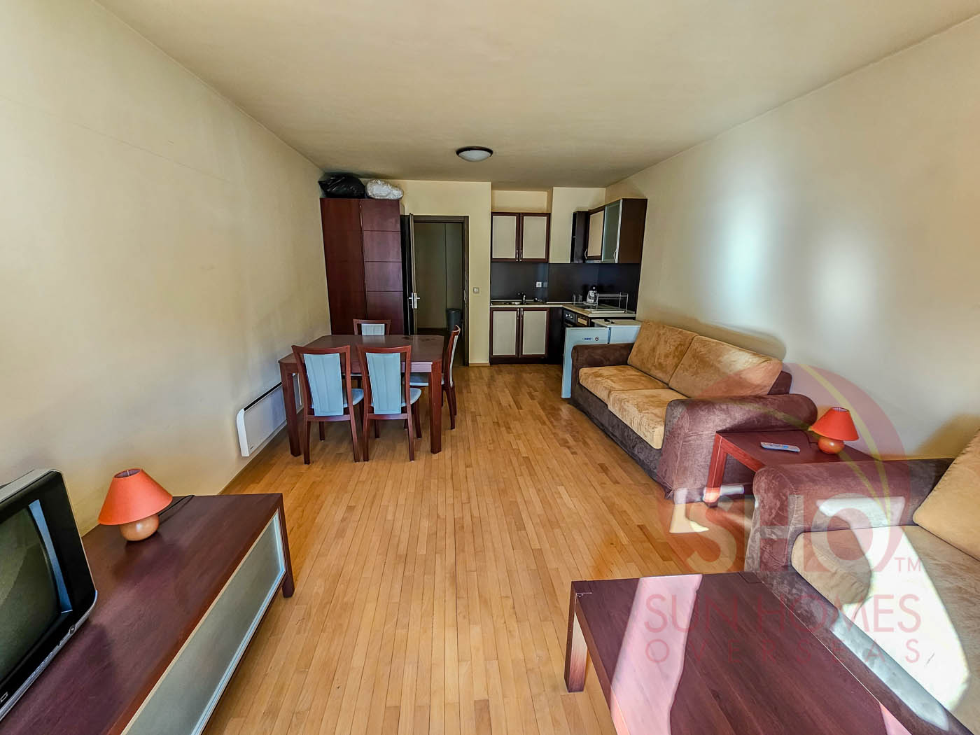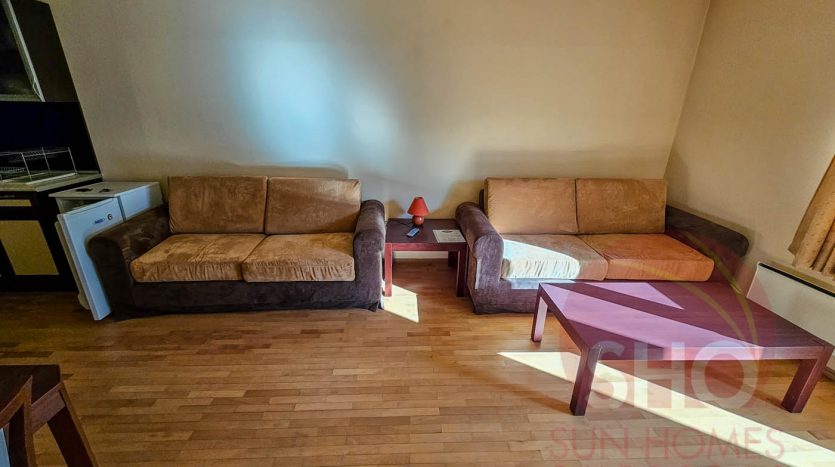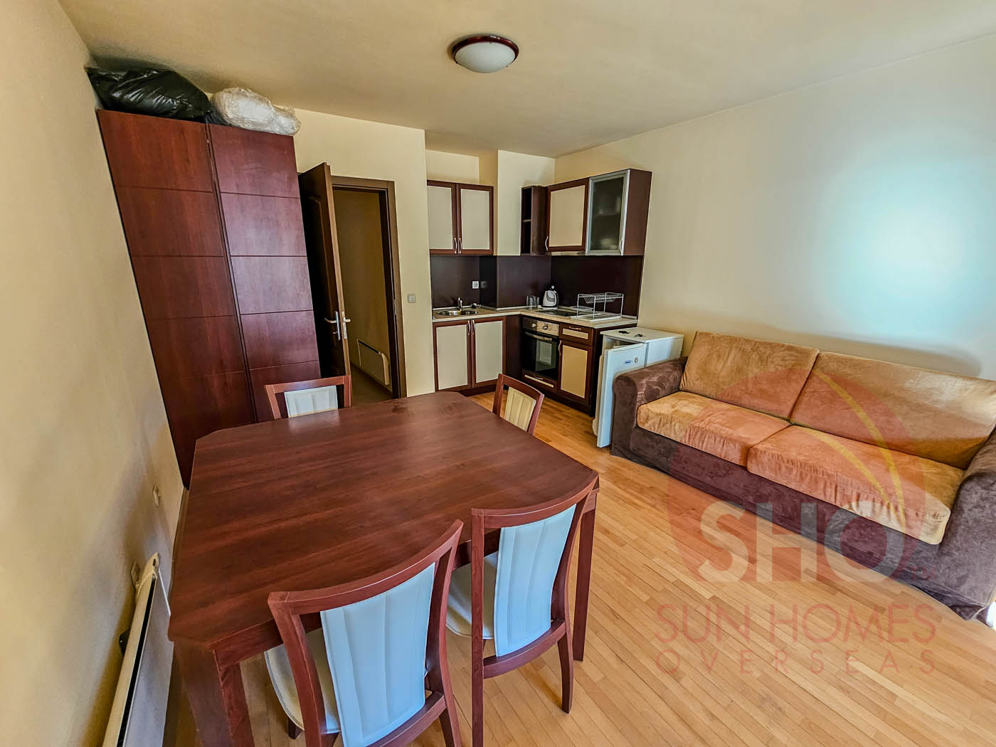 Viewing is recommended of this 2nd floor studio apartment which is to be sold furnished. The property consists of a huge entrance hall, fully tiled bathroom with shower cabin, fully equipped kitchen with all white goods, dining table / chairs, lounge area with 2 sofa beds/TV/ wardrobe / storage units. Patio door opens from the lounge onto the spacious balcony which has South facing views over the garden area and mountains.